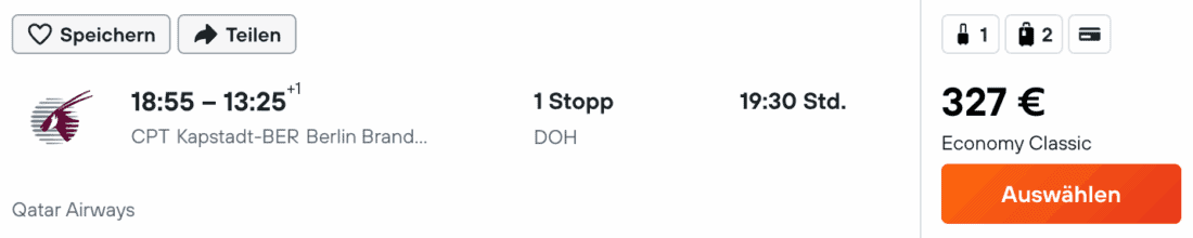 Nach Ankunft in Kapstadt gibt es viele Möglichkeiten für eure Rückreise. Ein Beispiel ist die Verbindung mit Qatar Airways am 3. November 2025 nach Berlin, welcher aktuell schon ab 327€ (inkl. 2x 23 kg Aufgabegepäck) buchbar ist: