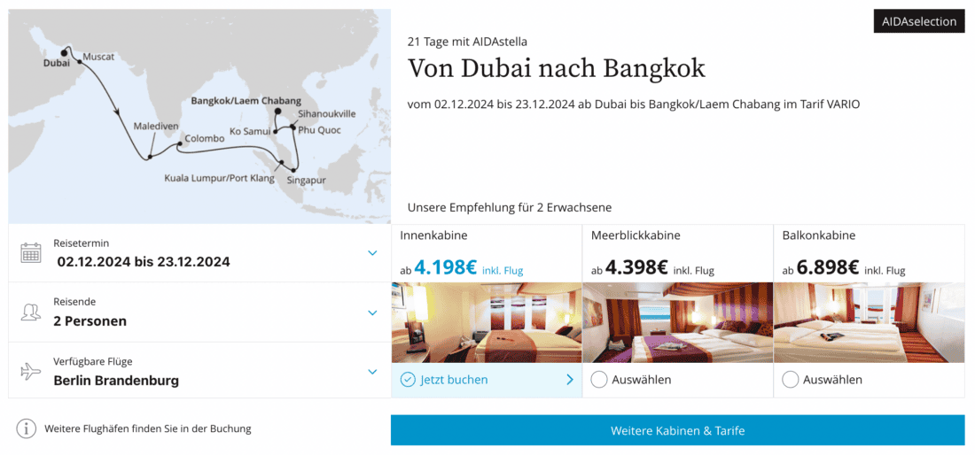 Die AIDAstella ist in der kommenden Wintersaison auf verschiedenen Kreuzfahrten in Asien unterwegs. Momentan könnt ihr euch eine dreiwöchige Reise von Dubai nach Bangkok im Dezember 2024 zum besonders attraktiven Preis inkl. Flug sichern. Während der Fahrt gibt es Zwischenstopps u.a. auf den Malediven, Kuala Lumpur und Singapur. Eine Innenkabine ist schon ab 2.099€ pro Person buchbar. Ebenfalls erschwinglich sind die Außenkabinen ab 2.199€, während für eine Balkonkabine 3.449€ fällig werden (jeweils pro Person bei Doppelbelegung).
