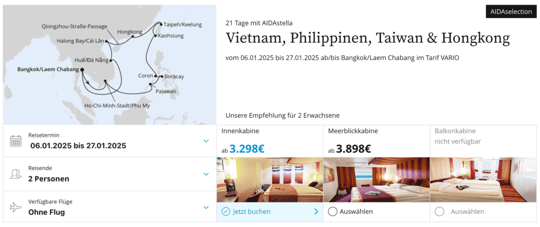 AIDA bietet derzeit eine interessante Route in Südostasien preislich fair an. Ihr erhaltet die Innenkabine auf der 22-tägigen Kreuzfahrt mit Abfahrt von Bangkok (Laem Chabang) ab 1.649€ und die Außenkabine ab 1.949€ (jeweils pro Person bei Doppelbelegung). Die Balkonkabinen sind bereits ausgebucht. Für Alleinreisende ist die Kreuzfahrt bereits ausgebucht. Vollpension und Trinkgelder sind inklusive. Los geht es am 6. Januar 2025.