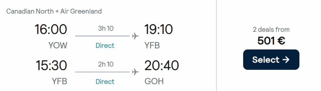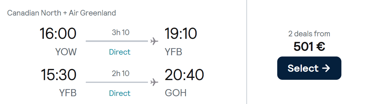 Günstiger wäre es da, den Inlandsflug auf das gleiche Ticket zu buchen. Ein Kombi-Ticket Ottawa – Iqaluit – Nuuk gibt es dann ab 494€ oder mit mehreren Tagen Stopover in Iqaluit ab 501€: