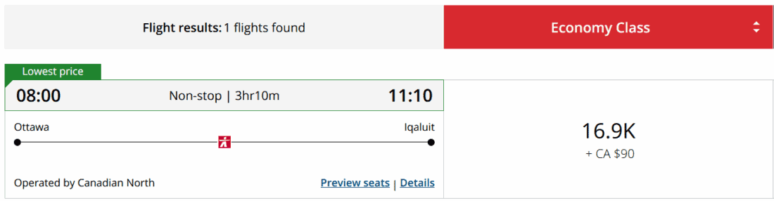 Alternativ lassen sich Flüge mit Canadian North auch mit Meilen buchen. Air Canada Aeroplan hat den Preis aber kürzlich erhöht, ein Oneway kostet jetzt 16.900 Meilen zzgl. 90 CA$ (~56 €). Vorher waren es noch 10.000 Meilen: