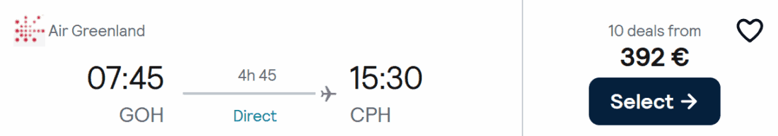 Günstige Termine findet ihr über unser Formular oben oder mithilfe von Google Flights (Anleitung). Buchen könnt ihr anschließend ab 193€ über OTAs im Skyscanner-Vergleich. Wir empfehlen aber die Buchung direkt bei Air Greenland für nur wenig mehr, nämlich 1.483 DKK (~199 €).