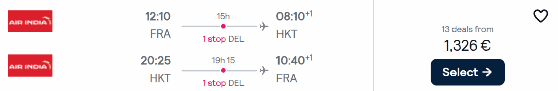 Buchen könnt ihr dann ab 1.326€ über Drittanbieter bei Kayak / Skyscanner bzw. ab rund 1.400€ direkt bei Air India.