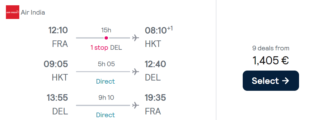 Der Tarif erlaubt Stopover in Delhi ohne Aufpreis. Es wird dann nur durch die höheren Steuern & niedrigeren OTA-Rabatte etwas teurer. Ab Frankfurt gibt es entsprechende Tickets ab 1.405€ – hier ein Beispiel mit 4 Tagen Aufenthalt: