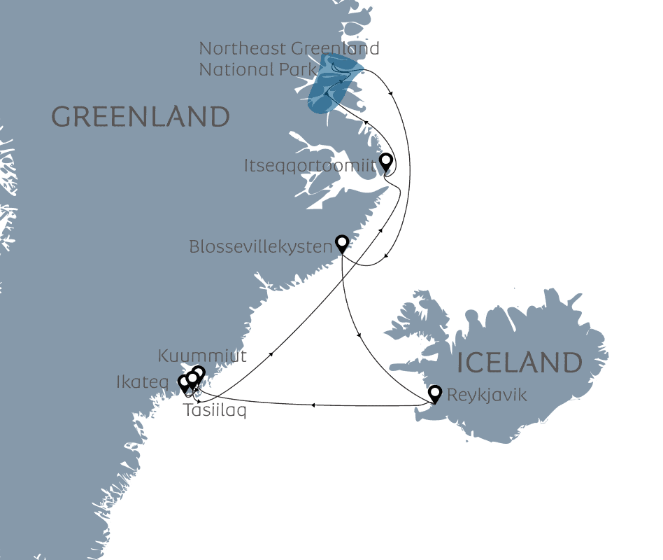 Diese Kreuzfahrt führt euch in eine der wildesten und abgelegensten Regionen der Welt: die atemberaubende Küste Ostgrönlands. Auf dieser Reise erlebt ihr die Schönheit und Vielfalt der Region und entdeckt das Beste, was die Region zu bieten hat. Ein besonderer Höhepunkt ist dabei die Fahrt im Northeast Greenland National Park, welcher mit einer Fläche von fast einer Million Quadratkilometern der größte Nationalpark weltweit ist.