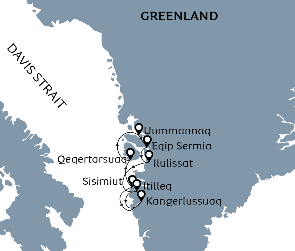 - 7 Nächte ab/bis Kangerlussuaq vom 23. bis 30. August 2025 (inklusive Hin- und Rückflug von Kopenhagen nach Kangerlussuaq)