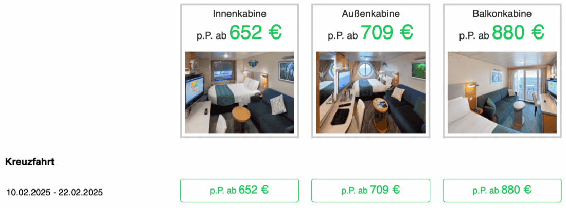 Die Allure of the Seas der US-Reederei Royal Caribbean fährt im Februar 2025 von Miami nach Barcelona. Diese Atlantiküberquerung mit einer Dauer von 12 Nächten könnt ihr aktuell in einer Innenkabine schon ab 652€ pro Person buchen. Das ist ein gutes Preis-Leistungs-Verhältnis. Nur geringfügig teurer sind die Außenkabinen ab 709€. Eine Balkonkabine könnt ihr euch ab 880€ (jeweils pro Person bei Doppelbelegung) sichern.