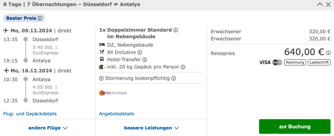 Für 7 Übernachtungen (Beispieldatum: 9. bis 16. Dezember 2024) inkl. Flügen ab/bis Düsseldorf zahlt ihr über Check24 beim Reiseveranstalter We Flytour aktuell nur 320€ pro Person: