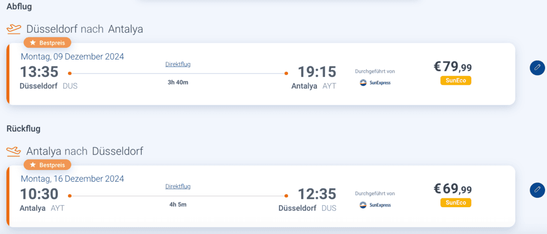 Für die Flüge mit SunExpress würdet ihr bei individueller Buchung inkl. Aufgabegepäck bereits 150€ pro Person zahlen.