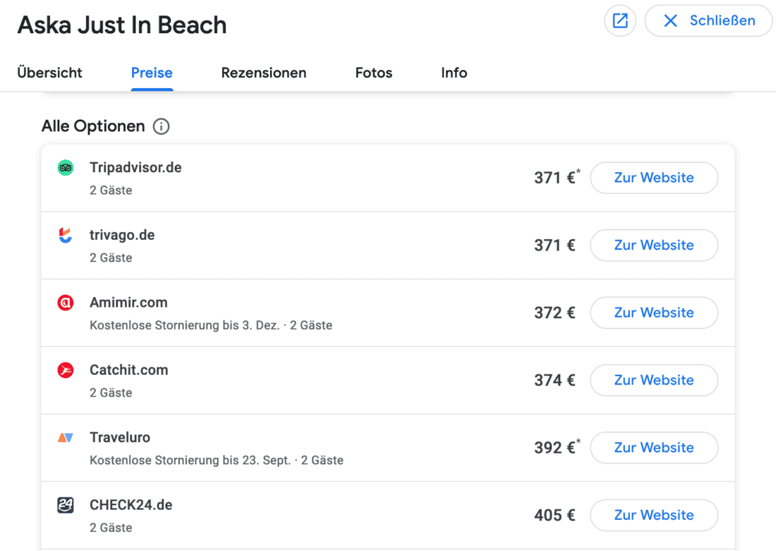 Bei separater Buchung des Hotels würden im Beispielzeitraum mindestens 371€ (bzw. 185,50€ pro Person) fällig werden: