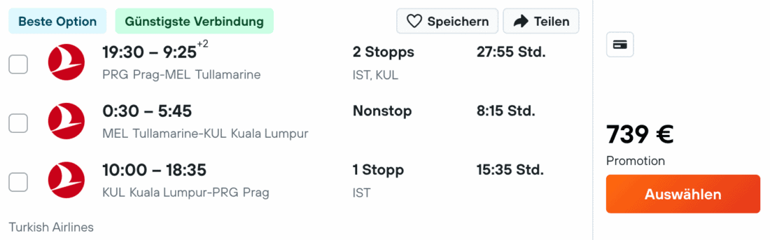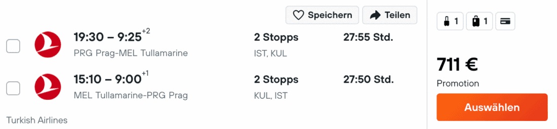 Turkish Airlines, ein Mitglied der Star Alliance, hat derzeit ein solides Angebot für Flüge nach Australien in petto. Mit Abflug von Prag bekommt man den Hin- und Rückflug nach Melbourne ab 711€. Dabei ist Aufgabegepäck bereits inklusive. Verfügbarkeiten findet ihr für Reisen im Oktober und November 2024 sowie Februar und März 2025. Stopover in Istanbul sind möglich, kosten jedoch rund 40€ Aufpreis.