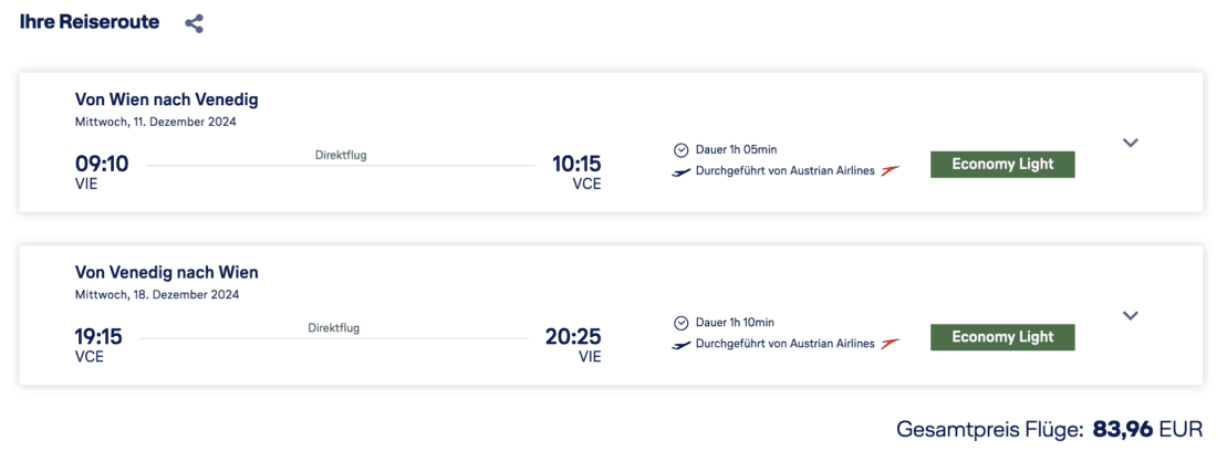 Das Star-Alliance-Mitglied Austrian Airlines hat gerade einen guten Kurs für Flüge nach Venedig geladen. Mit Abflug von Wien kann man bei Verfügbarkeiten von November 2024 bis März 2025 ab 84€ in den Norden Italiens reisen.
