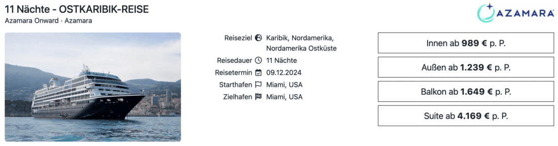 Aktuell gibt es ein interessantes Angebot für eine Kreuzfahrt durch die Karibik auf der Azamara Onward. Das Kreuzfahrtschiff der Reederei Azamara bricht im Dezember 2024 zu einer 12-tägigen Reise mit Start und Ziel in Miami auf. Eine Innenkabine könnt ihr euch aktuell bereits ab 989€ pro Person sichern. Wer es etwas geräumiger mag, der kann sich eine Außenkabine ab 1.239€ sowie eine Balkonkabine ab 1.649€ sichern (jeweils pro Person bei Doppelbelegung).