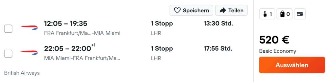 Die Kreuzfahrt startet und endet in Miami. Für die An- und Abreise nach Florida gibt es daher zahlreiche Möglichkeiten. Ein Beispiel sind Flüge mit British Airways ab Frankfurt über London, wobei der Hinflug am 7. Dezember und der Rückflug am 21. Dezember 2024 erfolgt. Diese Kombination ist aktuell ab 520€ (zzgl. ca. 150€ für Aufgabegepäck) buchbar: