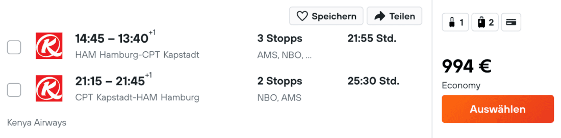 Die Kreuzfahrt startet und endet in Kapstadt. Ein Beispiel für die An- und Abreise nach Südafrika sind Flüge ab Hamburg vom 17. Dezember 2024 bis 7. Januar 2025 mit KLM und Kenya Airways. Diese Kombination ist momentan ab 994€ (inkl. Aufgabegepäck) buchbar: