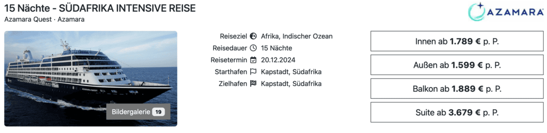 Die Azamara Quest startet am 20. Dezember von Kapstadt aus zu einer Kreuzfahrt über Weihnachten und Silvester, bei welcher verschiedene Ziele in Südafrika angefahren werden. Angesichts des Reisezeitraums ist die Kreuzfahrt mit einer Dauer von 15 Nächten aktuell besonders günstig buchbar. Für 15 Nächte in einer Außenkabine zahlt ihr 1.599€ pro Person. Weitere Optionen sind Innenkabinen ab 1.789€ sowie Balkonkabinen ab 1.889€ (jeweils pro Person bei Doppelbelegung).