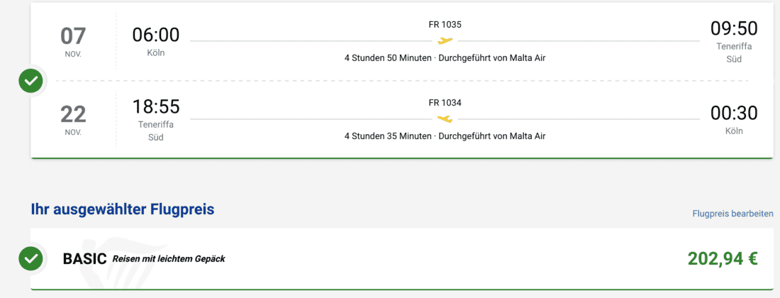 Solltet ihr stattdessen jedoch Direktflüge ab Deutschland bevorzugen, so könnt ihr beispielsweise mit Ryanair ab Köln fliegen. Die passenden Hin- und Rückflüge gibt es momentan ab 203€ (zzgl. 74€ für 20 kg Aufgabegepäck):