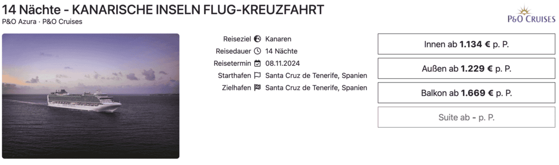 Die Azura der Reederei P&O Cruises ist im Herbst bzw. Winter auf zweiwöchigen Kreuzfahrten zu den Kanarischen Inseln im Einsatz. Die Reise startet und endet jeweils auf Teneriffa. Aktuell könnt ihr die günstigste Innenkabine ab 1.134€ pro Person buchen. Ebenfalls interessant sind die Außenkabinen ab 1.229€, für eine Balkonkabine werden mindestens 1.669€ fällig (jeweils pro Person bei Doppelbelegung).
