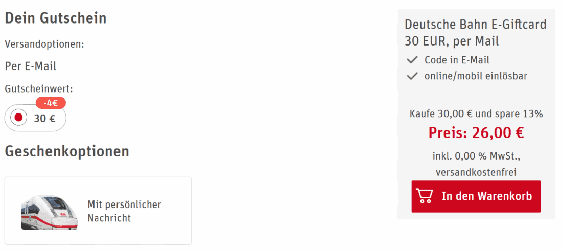 Rewe bietet diese Woche reduzierte Geschenkgutscheine für die Deutsche Bahn an. Die Karten können entweder in der Filiale oder online in der Rewe Kartenwelt gekauft werden. Bis 7. September 2025 kostet die 30€-Geschenkkarte dann nur 26€. So ergibt sich eine Ersparnis von 13% auf (fast) alle Fahrkarten der DB.