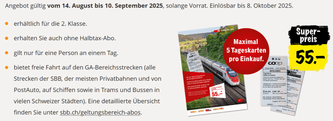 In der Schweiz gibt es regelmäßig interessante Angebote für alle, die mit dem öffentlichen Verkehr (öV) durchs Land reisen wollen. Seit dieser Woche sind bei Coop und Interdiscount wieder Spezial-Tageskarten erhältlich. Leider kosten sie mittlerweile 55 CHF (~59 €) – in den letzten Jahren waren 49 Franken der Normalpreis.