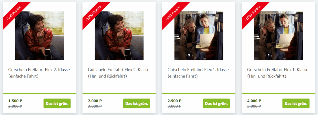 Für begrenzte Zeit, nämlich bis 18. Juni 2025, gibt es verschiedene Prämien in der Prämienwelt zu reduzierten Preisen. Besonders interessant sind dabei die flexiblen Freifahrten. Eine Freifahrt Flex für Hin- und Rückfahrt (2. Klasse) gibt es beispielsweise für 2.000 statt regulär 3.000 Punkte. Nach dem „Kauf“ habt ihr dann ein Jahr Zeit, euch für einen Wunschtermin zu entscheiden.