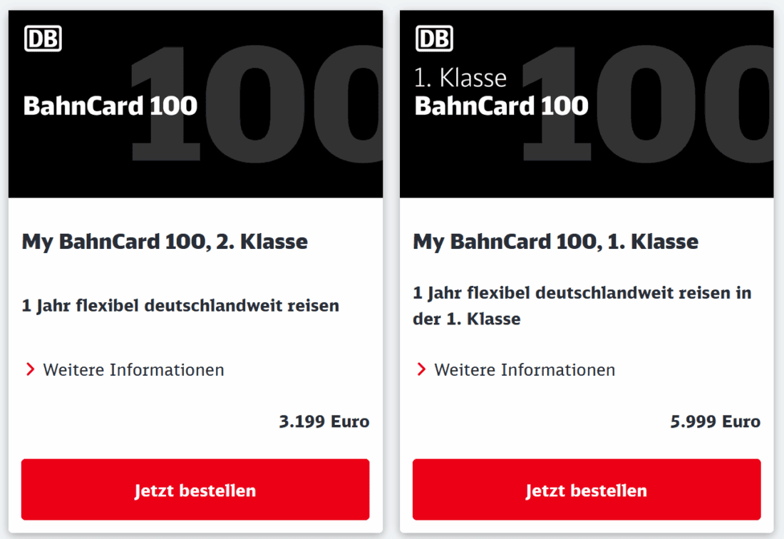 - My BahnCard 100, 1. Klasse für 5.999€ statt 7.999€ (25% Ersparnis)