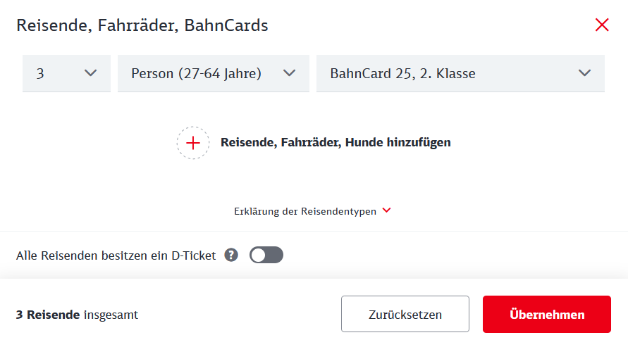 Vergesst nicht, danach auf Übernehmen zu drücken, damit die Änderung auch angewandt wird. Der Rabatt wird dann automatisch für alle Reisenden angewandt.