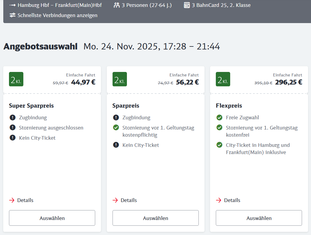 Mit der Rabattaktion könntet ihr am 24. November zum Beispiel zu dritt für nur 14,99€ p.P. von Hamburg nach Frankfurt fahren. Es muss nur eine der drei Personen über eine BahnCard 25 (oder 50) verfügen:
