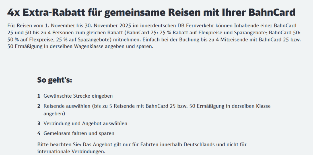 - Bis zu vier Mitreisende erhalten den gleichen Rabatt wie der BahnCard-Inhaber