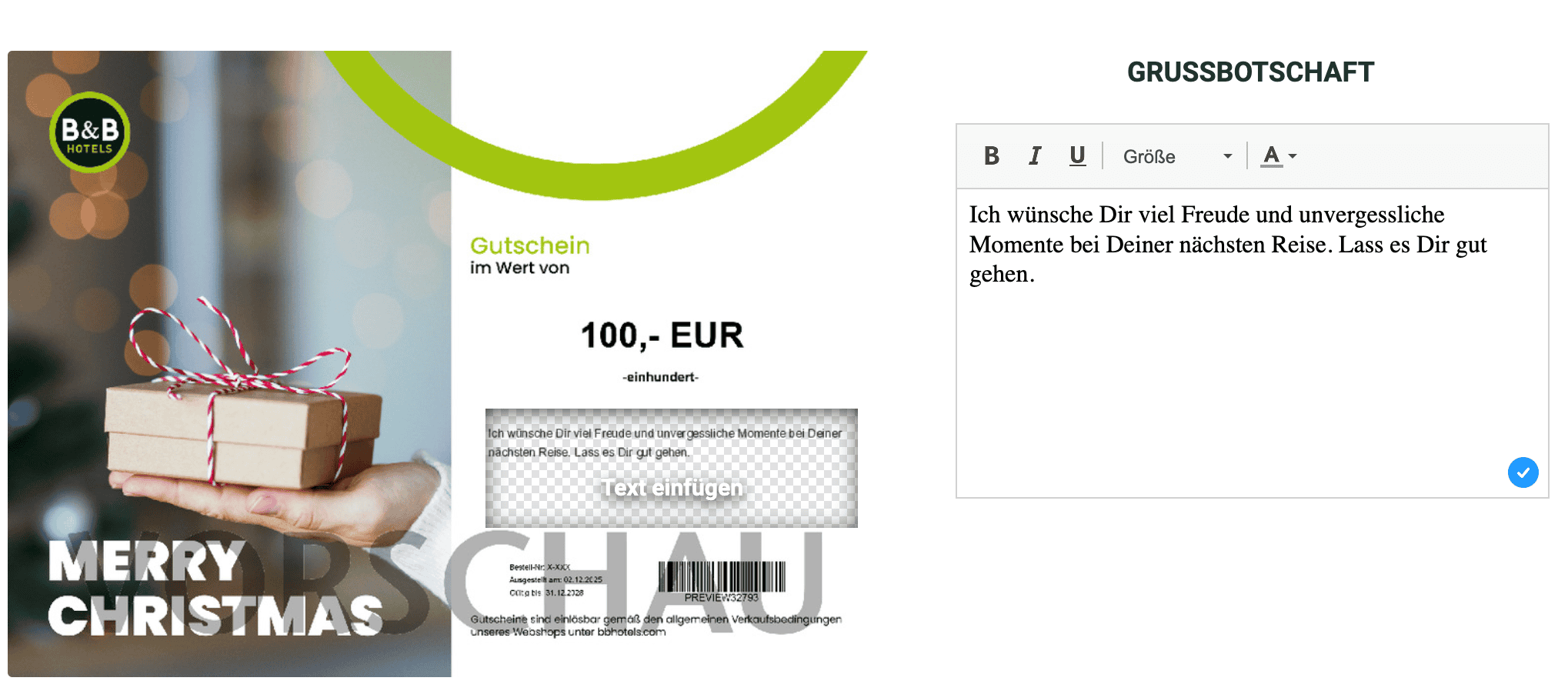 Anschließend habt ihr die Möglichkeit, eine Grußkarte mit einer persönlichen Botschaft zu gestalten, sofern der Gutschein verschenkt werden soll. Darüber hinaus stehen verschiedene Themen als Vorlage zur Verfügung (z.B. Feiertage, Allgemein, Glückwünsche):