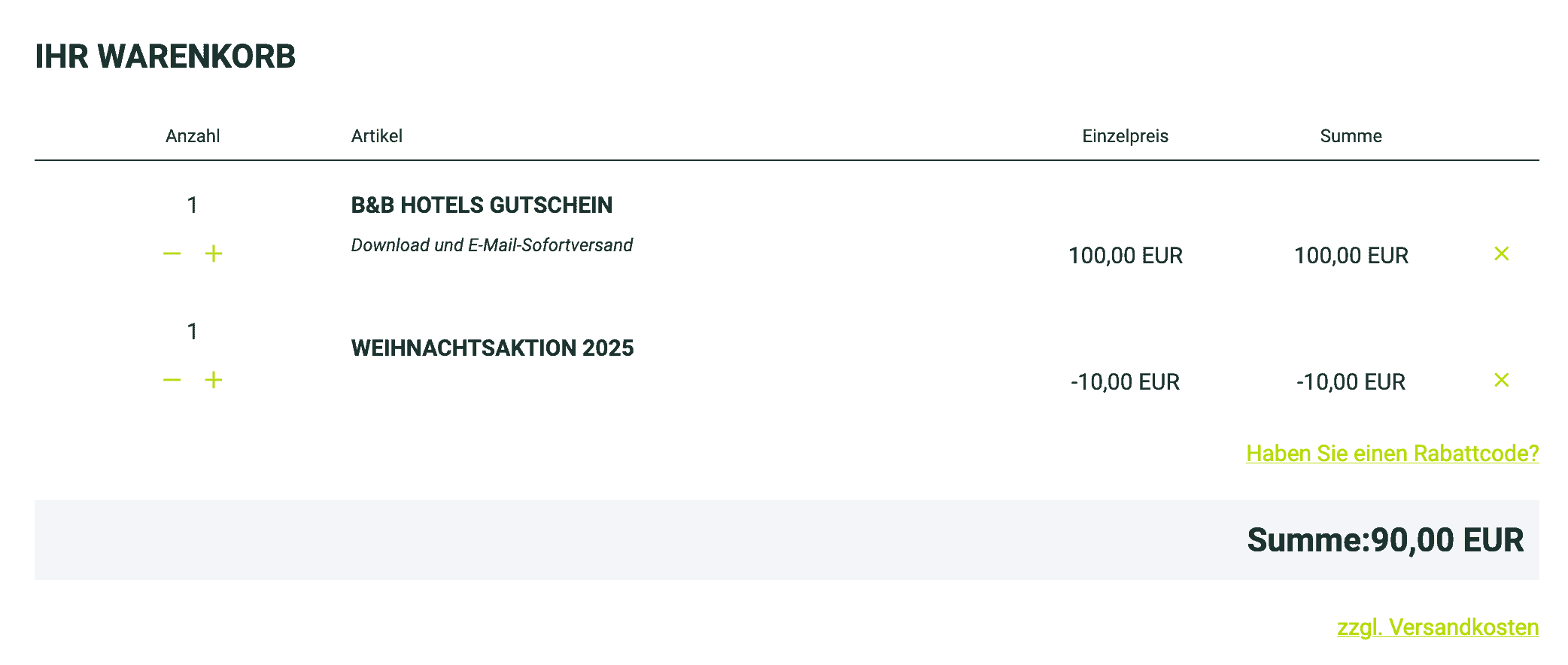Bei den B&B Hotels gibt es im Dezember eine besondere Weihnachtsaktion. Dabei könnt ihr euch entweder selbst mit Gutscheinen für zukünftige Hotelaufenthalte eindecken oder einen Gutschein für die Familie bzw. Freunde kaufen. Beim Kauf von Wertgutscheinen bis zum 31. Dezember 2025 erhaltet ihr einen Rabatt in Höhe von 10% auf den jeweiligen Gutscheinwert.