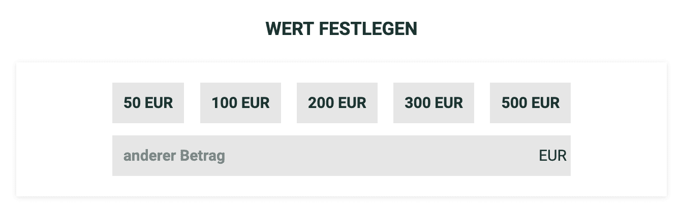 Zunächst müsst ihr euch für den Wert des Gutscheins entscheiden. Zur Wahl stehen die fest definierten Beträge in Höhe von 50, 100, 200, 300 und 500€. Zusätzlich könnt ihr aber auch jeden anderen Wert eingeben, jedoch mindestens 20€: