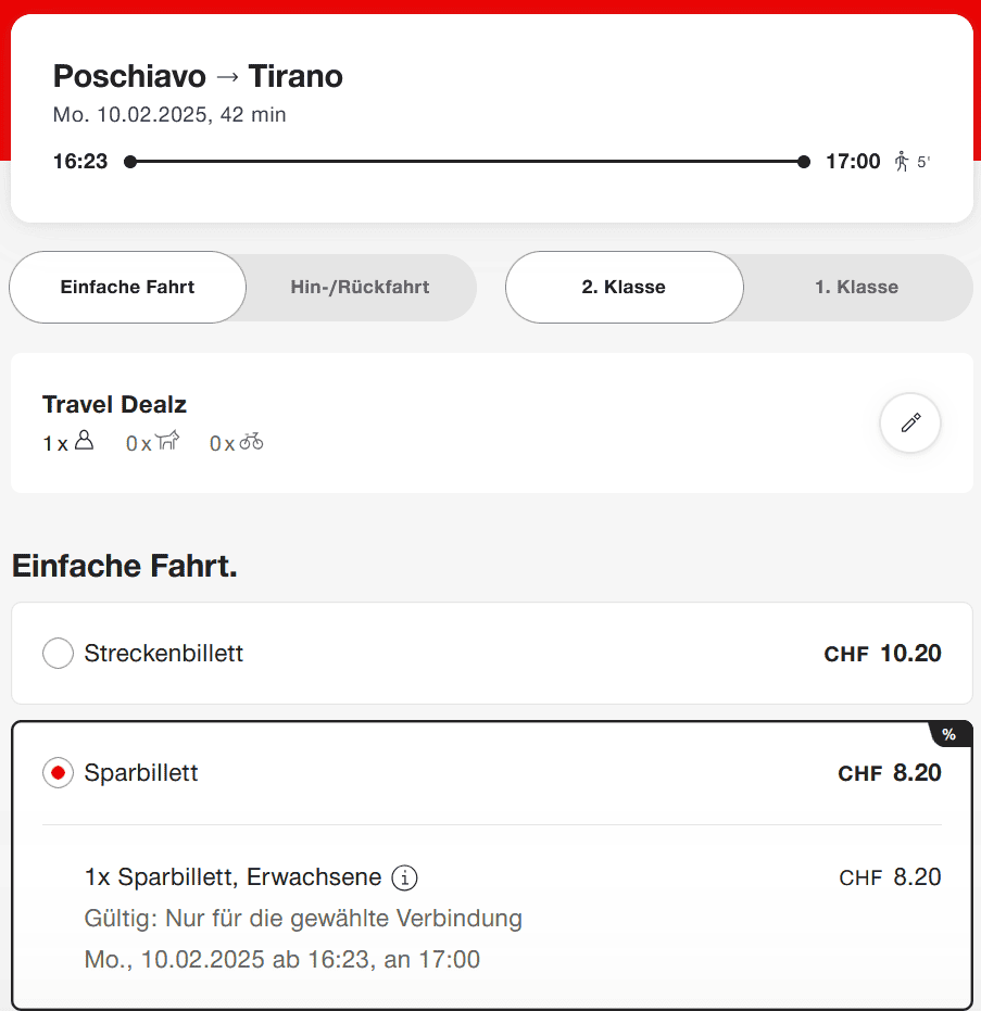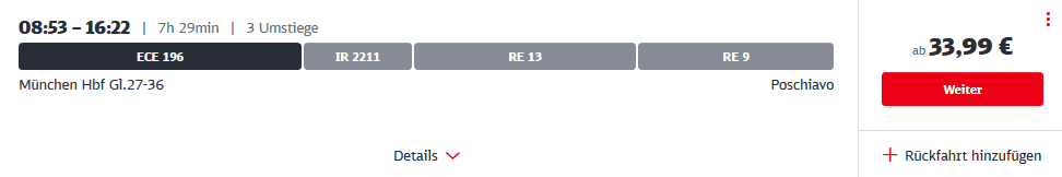 Wer aus Deutschland kommt, kann sich bei der Bahn natürlich einen passenden Sparpreis nach Chur buchen. Das lohnt sich aber nicht zwangsläufig. Die Bahn bietet zwar mittlerweile keine Sparpreise nach Tirano an, dafür aber bis Poschiavo kurz vor der Grenze ab 34€: