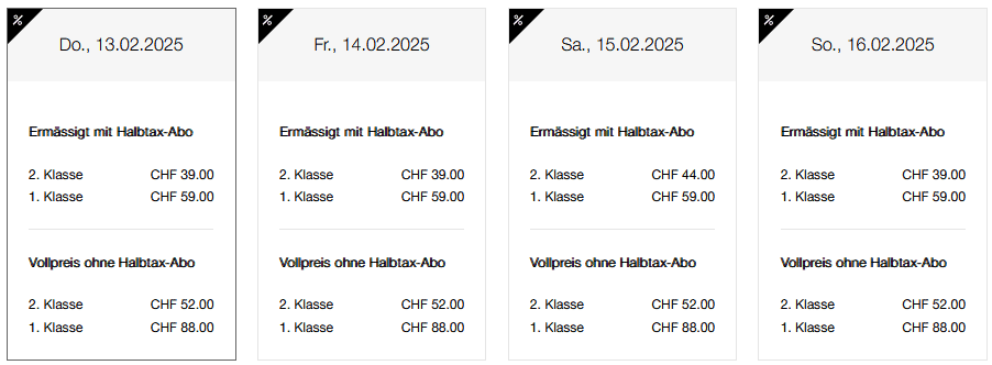 Die Tickets sind günstiger, je früher ihr sie bucht. Bei entsprechender Vorausbuchung starten die Preise meist bei 39 CHF (~42 €) mit Halbtax bzw. 52 CHF (~56 €) für alle anderen. Im Gegensatz zur Spezial-Tageskarte seid ihr hier fest an den gebuchten Tag gebunden: