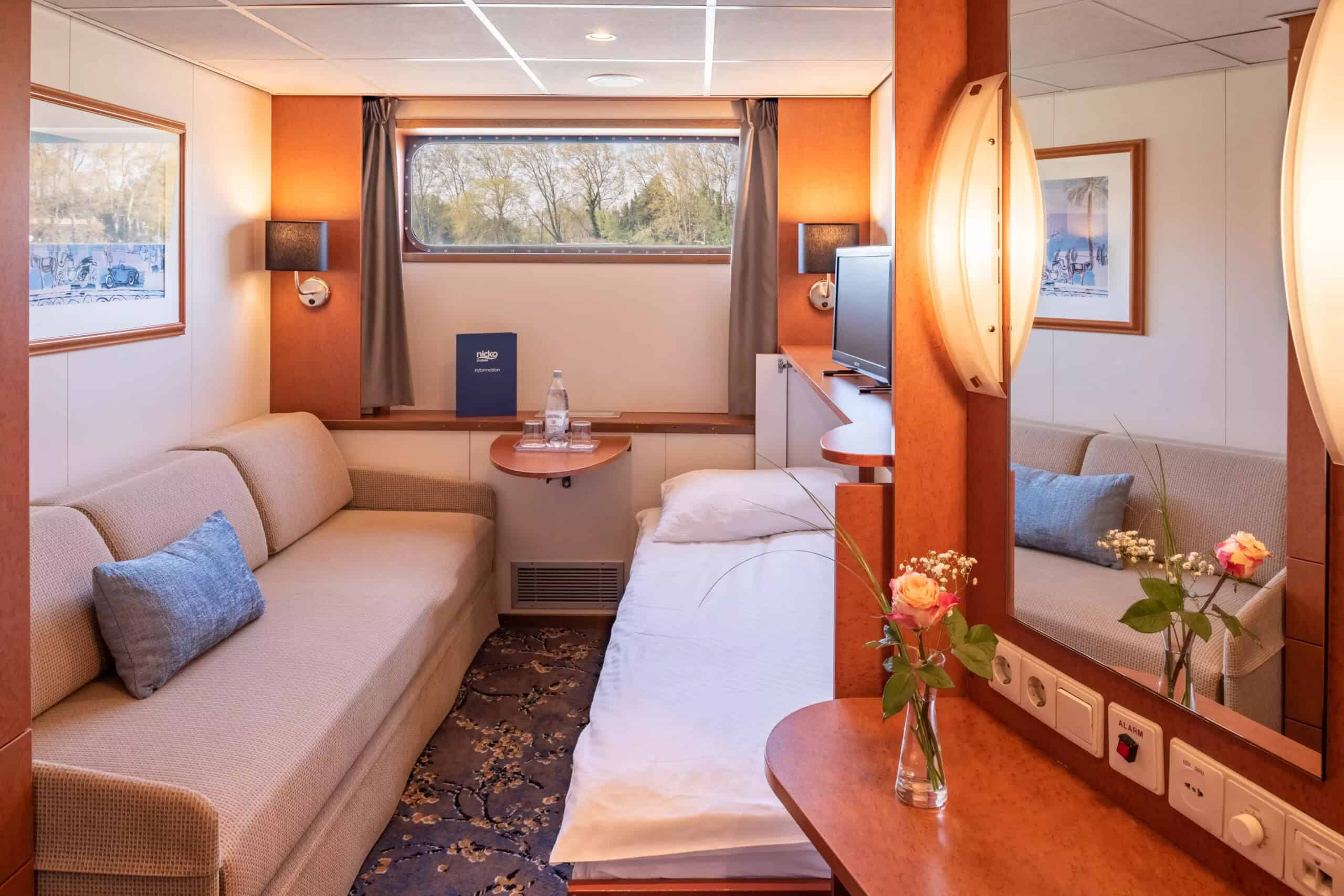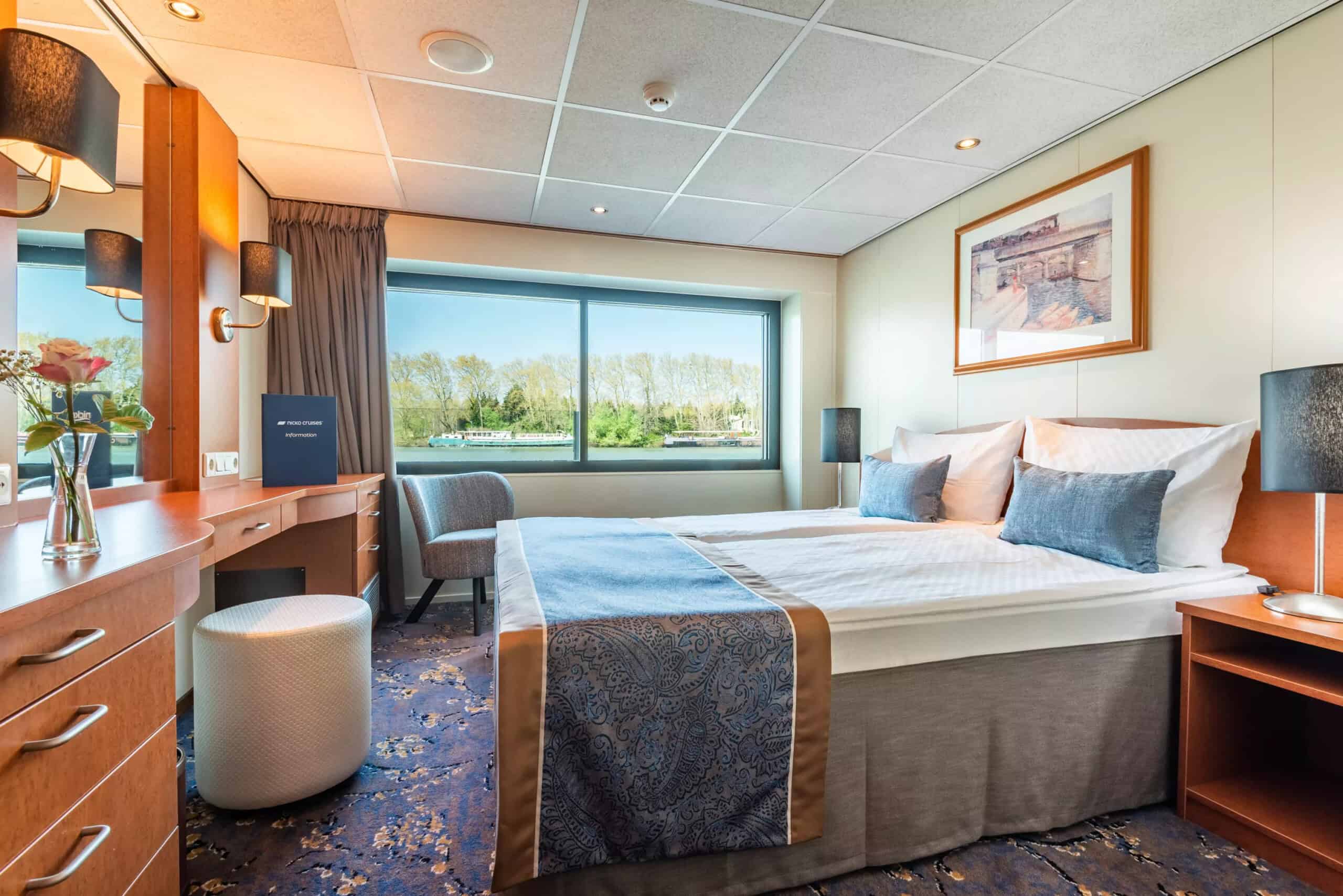 Die Außenkabinen auf dem Hauptdeck sind ca. 11 m² groß, mit einem Klappbett und einem Sofabett ausgestattet und verfügen über ein Panoramafenster, welches nicht geöffnet werden kann. Die Kabinen auf dem Mittel- und Oberdeck bieten ca. 14 m² Platz und sind mit einem Doppelbett ausgestattet, das sich auf Wunsch trennen lässt. Das Panoramafenster kann in diesem Fall in manchen Kabinen geöffnet werden.