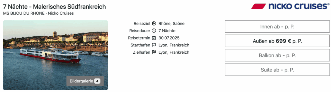 Habt ihr spontan Lust auf eine Flusskreuzfahrt in Südfrankreich zur besten Reisezeit? Dies muss kein Traum bleiben, wenn ihr zeitlich flexibel seid. Bereits in wenigen Tagen, genauer gesagt am 30. Juli 2025, startet die einwöchige Reise von Lyon. Zum Einsatz kommt das Schiff Bijou du Rhône von Nicko Cruises und ihr könnt euch eine der letzten verfügbaren Außenkabinen ab 699€ pro Person sichern. Alleinreisende zahlen in einer Außenkabine auf dem Hauptdeck (Kategorie HG) aktuell 1.223€.