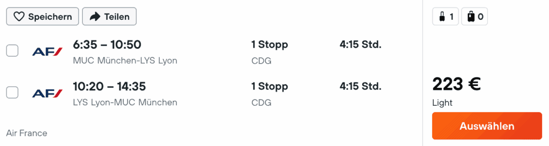 Die Flusskreuzfahrt startet und endet in Lyon. Zur An- und Abreise nach Frankreich könnt ihr u.a. Flüge mit Air France von München über Paris nutzen. Bei Hinflug am 28. Juli und Rückflug am 7. August 2025 sind entsprechende Verbindungen ab 223€ (zzgl. ca. 80€ für Aufgabegepäck) buchbar: