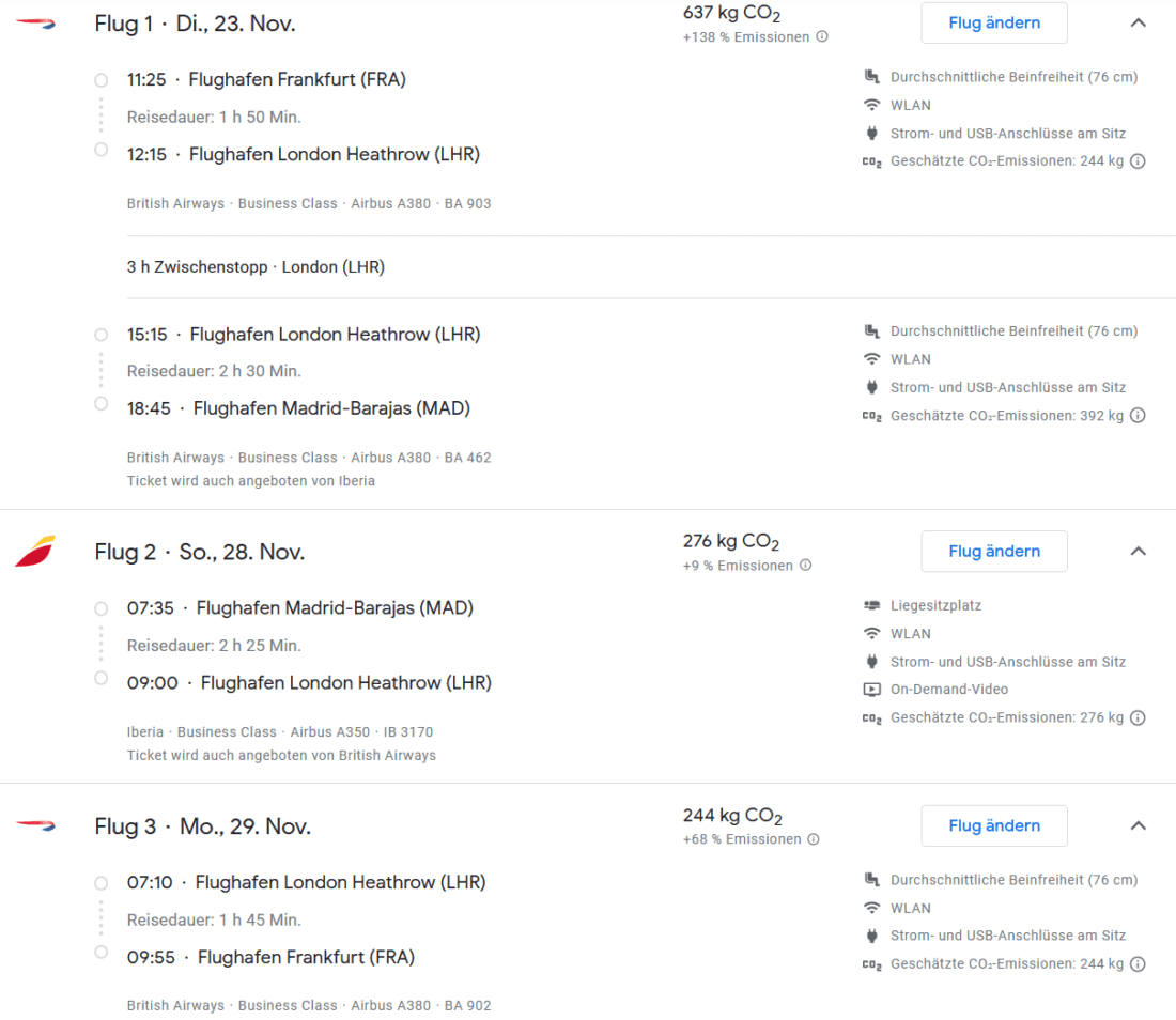Der A380 wird sowohl bei Google Flights (Anleitung) als auch direkt bei British Airways in der Flugsuche angezeigt. Bei Google Flights erkennt ihr ihn auch direkt an den höheren CO2-Emissionen: