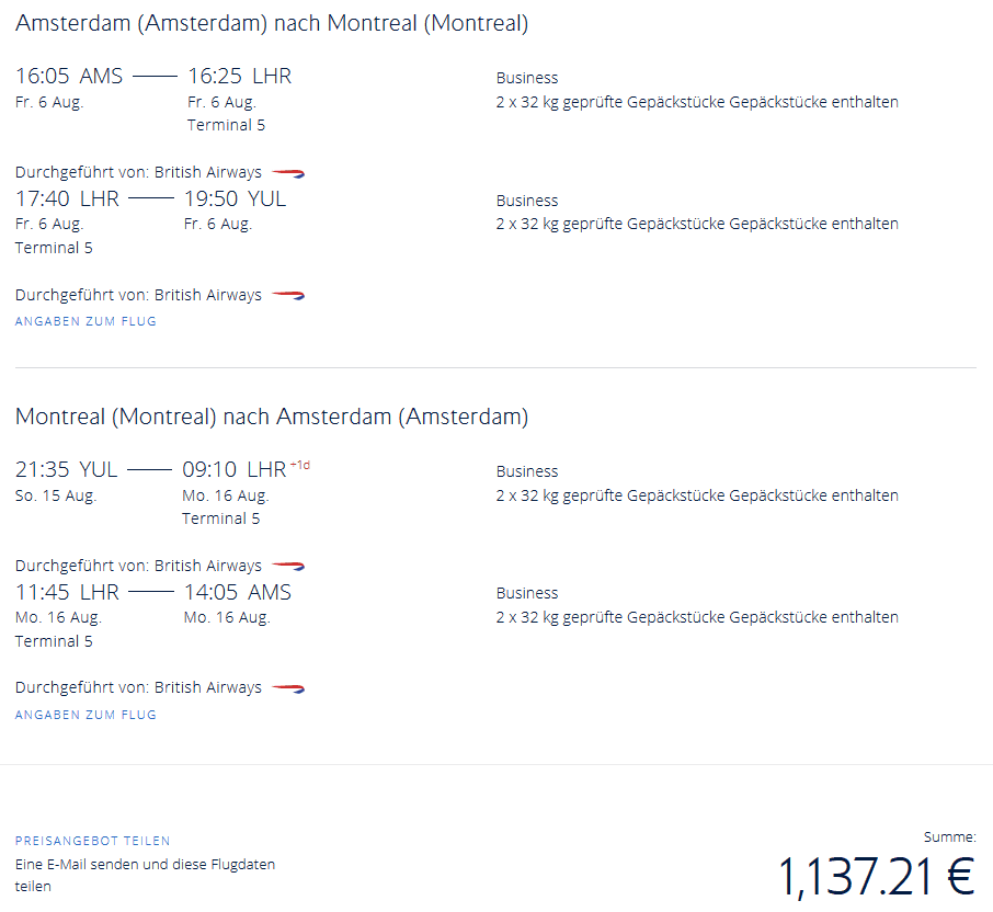 British Airways verkauft aktuell Business-Class-Flüge von Amsterdam nach Montreal, Kanada für 1.137€. Termine gibt es allerdings nur im Hochsommer, d.h. im Juli und August 2021.