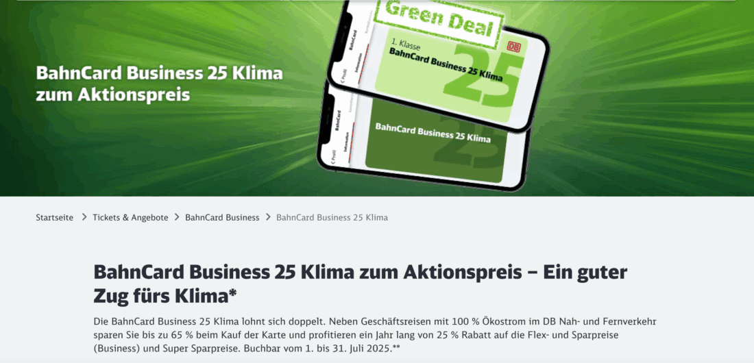 Die Deutsche Bahn hat heute wieder ein interessantes Angebot für Geschäftskunden aufgelegt. Diese können bei Buchung bis zum 31. Juli 2025 das Jahresabo BahnCard 25 1. Klasse für nur 49,99€ abschließen. Normalerweise kostet die Karte 144€ / Jahr, wobei die private BC 25 1. Klasse für 125€ womöglich der bessere Vergleichspreis ist. In der 2. Klasse ist die BahnCard für Geschäftskunden aktuell für 35€ (statt regulär 73€) erhältlich.