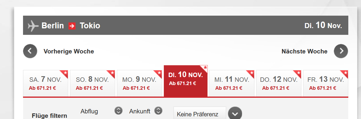 Termine findet ihr über Google Flights (Anleitung). Allerdings wird dort nicht alles korrekt abgebildet. Besser funktioniert die Suche bei JAL. Nehmt einfach ein spezifisches Datum und sucht Flüge vom gewünschten Abflughafen nach TYO, dann wird euch im Verlauf die Kalenderfunktion angezeigt. Hier im Beispiel für die Hinflüge ab Berlin: