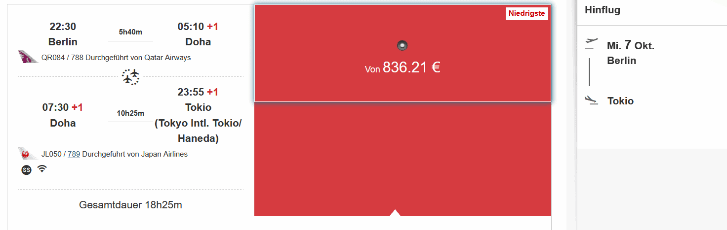 Kleiner Tipp: Bei mir zeigt es die Preise über die Qatar Webseite nicht an aber da die meisten Flüge code share sind mit Japan Airlines sieht man die Preise über diese Webseite.