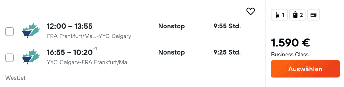 Momentan gibt es vergleichsweise günstige Tickets für Condor Business Class Flüge nach Westkanada. Ihr erreicht Calgary mit Abflug von Frankfurt ab 1.590€. Verfügbarkeiten gibt es dabei aber leider nur kurzfristig für Abflüge Anfang August. Hin- und Rückflug erfolgen nonstop.