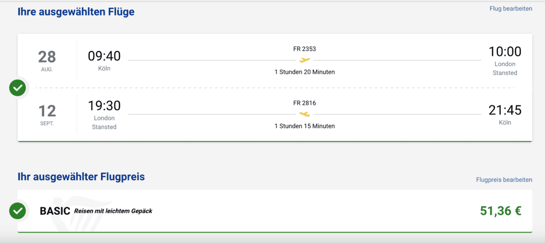 Eure Kreuzfahrt startet und endet in Southampton. Daher ist einer der Flughäfen im Großraum London für die An- und Abreise zu empfehlen. Eine mögliche Option sind Flüge mit Ryanair ab Köln zum Airport London-Stansted, wobei der Hinflug am 28. August und der Rückflug am 12. September 2024 erfolgt. Diese Flüge sind momentan ab 52€ (+47€ für 20 kg Aufgabegepäck) buchbar:
