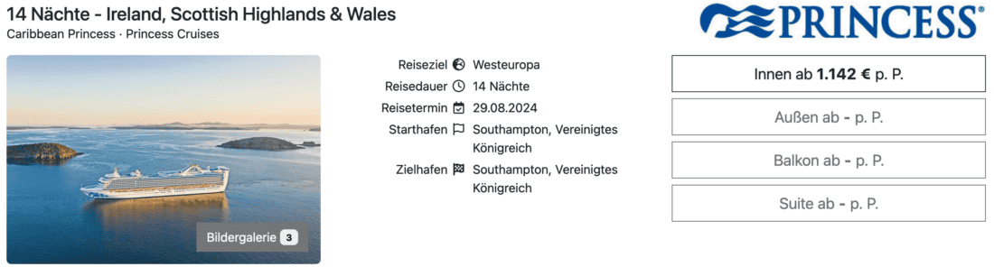 Die Caribbean Princess der US-Reederei Princess Cruises wird ab Ende August auf einer zweiwöchigen Kreuzfahrt rund um die britischen Inseln eingesetzt. Es gibt dabei Zwischenstopps in England, Irland, Wales, Nordirland und Schottland. Die Innenkabine auf dieser Kreuzfahrt ist ab 1.142€ pro Person verfügbar. Die Außen- und Balkonkabinen sind aktuell bereits ausgebucht.