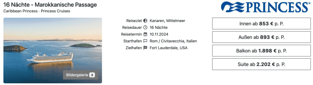 Die Caribbean Princess der US-Reederei Princess Cruises wird im November 2024 von Europa in die USA überführt. Falls ihr Lust auf mehrere Zwischenstopps in Europa sowie anschließend ein paar entspannte Tage auf dem Atlantik habt, so könnt ihr diese Überfahrt von Civitavecchia (bei Rom) nach Fort Lauderdale momentan in einer Außenkabine bereits ab 893€ pro Person buchen, was ein ausgezeichnetes Preis-Leistungs-Verhältnis für 16 Nächte ist.