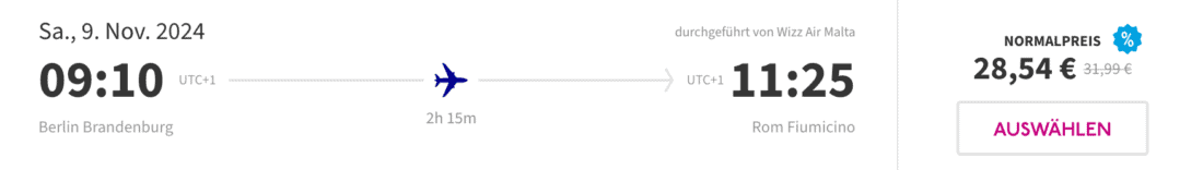 Die Kreuzfahrt startet in Civitavecchia und endet in Fort Lauderdale. Daher sind in diesem Fall zwei Oneway-Flüge notwendig. Für die Anreise nach Rom ist die Verbindung mit Wizzair von Berlin am 9. November 2024 empfehlenswert, welche aktuell ab 29€ (zzgl. 41€ für 20 kg Aufgabegepäck) buchbar ist:
