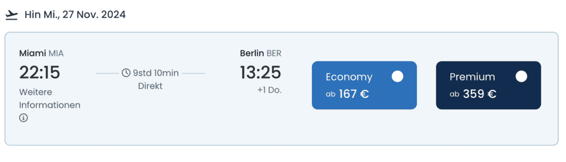 Nach Ankunft in Fort Lauderdale habt ihr verschiedene Möglichkeiten für euren Rückflug. Eine Option ist der Direktflug mit Norse Atlantic von Miami nach Berlin am 27. November 2024. Dieser ist momentan ab 167€ (zzgl. 69€ für 23 kg Aufgabegepäck) buchbar: