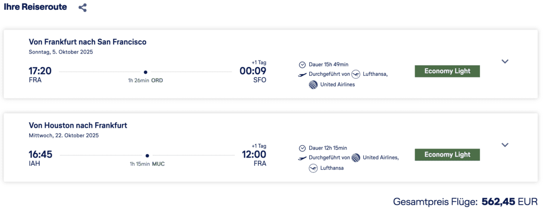 Die Kreuzfahrt startet in San Francisco und endet in Galveston im US-Bundesstaat Texas. Deshalb ist hier ein Gabelflug die beste Option. Ein Beispiel sind Flüge mit United bzw. Lufthansa. Dabei erfolgt der Hinflug am 5. Oktober 2025 von Frankfurt nach San Francisco und der Rückflug am 22. Oktober 2025 von Houston. Diese Kombination ist momentan ab 563€ (zzgl. 135€ für 23 kg Aufgabegepäck) buchbar:
