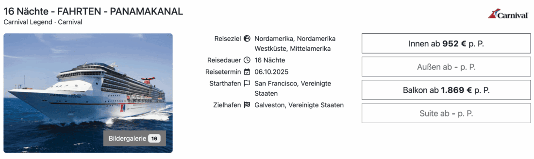 Die Carnival Legend der US-Reederei Carnival wird im Oktober 2025 auf einer eher ungewöhnlichen Route von San Francisco nach Galveston im Bundesstaat Texas eingesetzt und fährt während dieser Positionierung auch durch den Panamakanal.